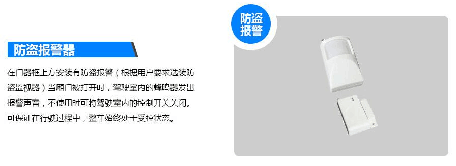 3、防盗报警器:为了保证安全,在车厢后方和侧面开设有门,在各门器框上方安装有门磁开关报警器(根据用户要求选装防盗监视器。行车记录仪等)当厢门被打开时,驾驶室内的蜂鸣器发出报警声音,不使用时可将驾驶室内的控制开关关闭。可保证在行驶过程中,整车始终处于受控状态。