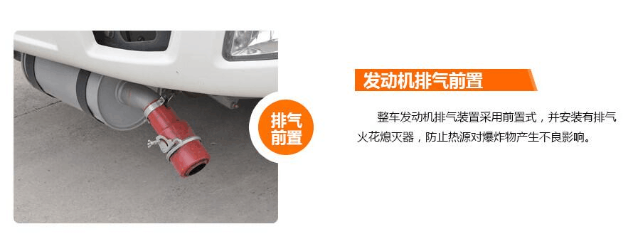 4、整车发动机排气装置采用前置式,并安装有排气火花熄灭器(防火罩),防止热源对爆炸物产生不良影响。