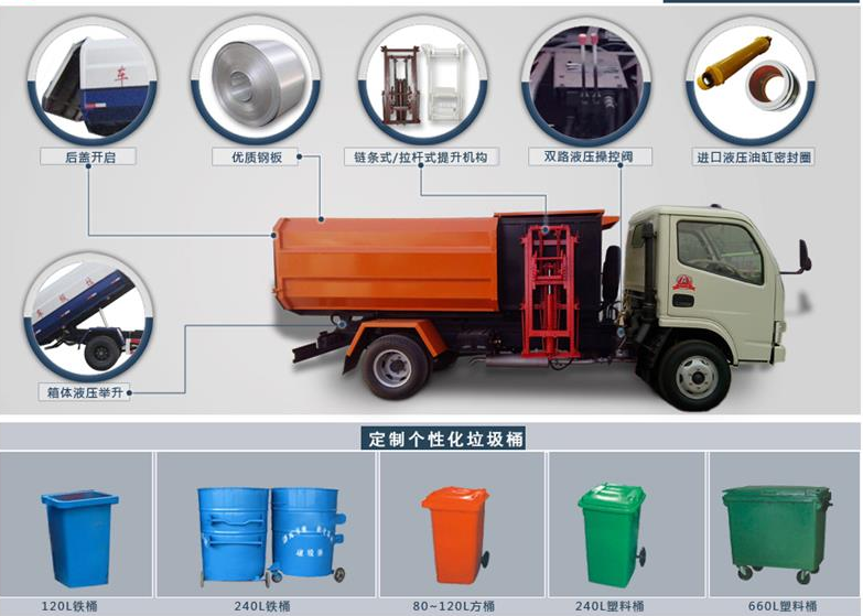 标配一个240L的挂桶提升架,请根据实际用车需求选择铁桶提升架或者塑料桶提升架,后门手动开启,举升自卸
