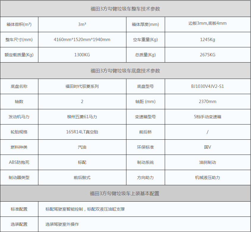 福田3方勾臂式垃圾车,采用福田时代驭菱系列微卡底盘,驭菱专用单排驾驶室,驾驶室宽度1500mm,底盘轴距2370mm,动力总成采用稳定性超高的柳州五菱汽油发动机,最大可输出61马力,正宗国V排放标准,配5档手动变速箱,油耗表现良好,动力输出平顺,提速有力。配置方面,配有方向助力、ABS等实用配置,整车性价比超高。