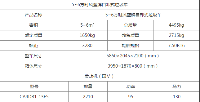 整车容积5~6立方米,自卸式箱体,箱体内部尺寸:3950×1870×800(mm),采用4毫米厚钢板制作,箱顶带液压盖板,可向两边展开折叠,箱底双缸液压自卸,手动尾门。