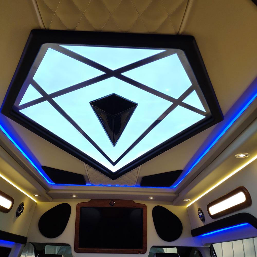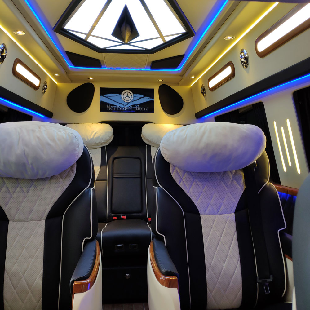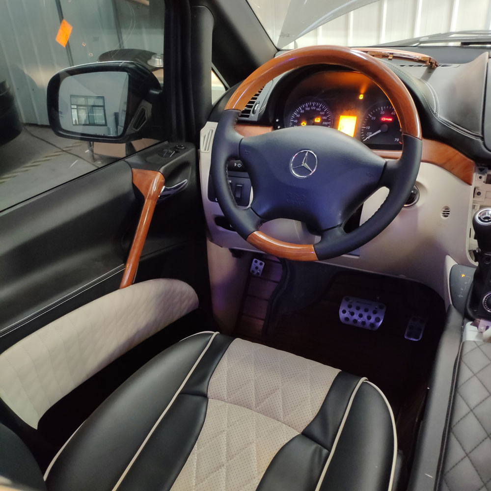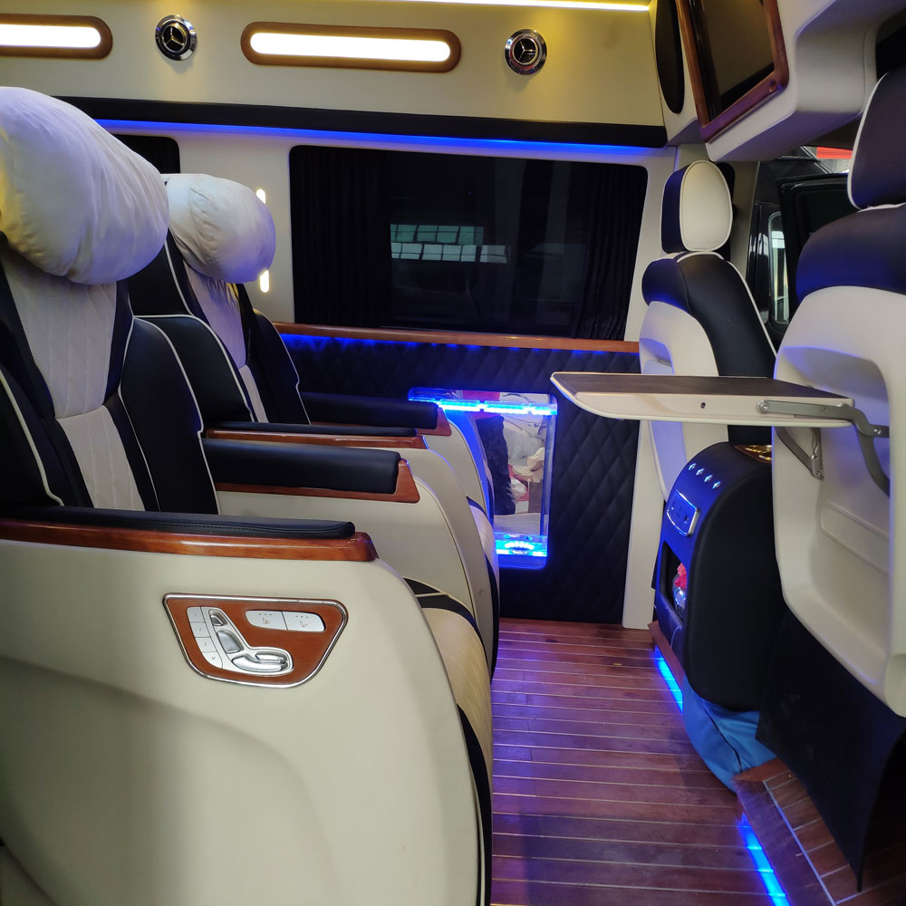 奔驰威霆商务车改装方面:全车真皮的座椅,前排两大进口航空座椅,包含座椅通风,加热,按摩,座椅记忆,360度旋转,原厂电动侧滑门,全景天窗,运动包围,加装海豚高顶,220V逆变器,外接电源,后排3连坐可放倒成一张沙发床,欧式双吧台,双运动腿拖,空气净化器,迈巴赫星光顶,私密隐私窗帘,奔驰专用导航系统及倒车影像,前后对讲机系统,踏板迎宾灯,车载电热水壶,桃木方向盘,梅赛德斯镀络套件等。